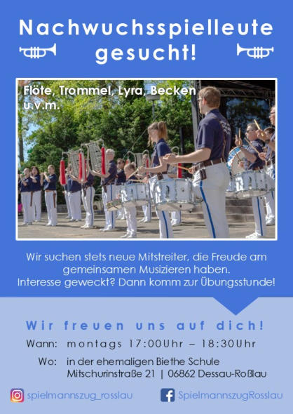Mitmachen kann jeder, auch ohne Vorkenntnisse. Der Verein hat mehrere Übungsgruppen, ab 8 Jahre kann man in der Nachwuchsabteilung mitmachen und auch die Erwachsenen freuen sich über neue Gesichter. Einsteigen kann man zu jeder Zeit. Alles was man für eine Karriere im Spielmannszug benötigt, erhält man vom Verein, sei es die Instrumente, Uniform, Noten und natürlich das Wissen. Übungsstunden finden jeden Montagfür den Nachwuchs von 17:00-18:30 Uhr und für die Erwachsenen 19:00-20:30 Uhr in der ehemaligen Biethe Schule (Mitschurinstraße 21)in Roßlau statt. Zur Auswahl an zu lernenden Instrumenten stehen: Trommel, Querflöte und Lyra. weiter zu Mitglied werdenWir freuen uns über Euren Besuch.